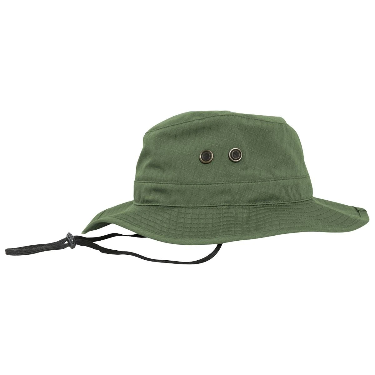 - Durable wide brim with stitching and snap fastener